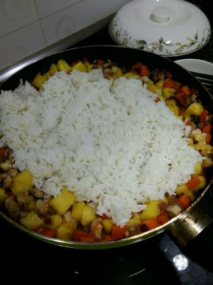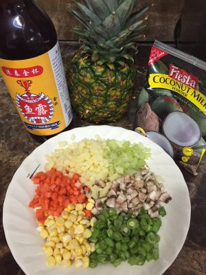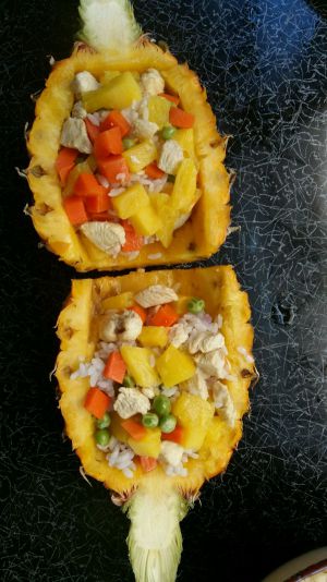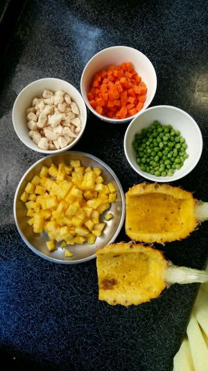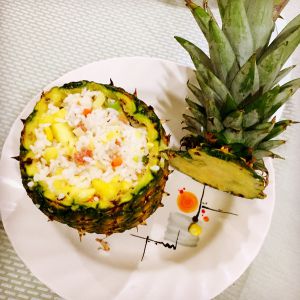 最后把米饭和蔬菜什锦烩一起,装菠萝里就可以了