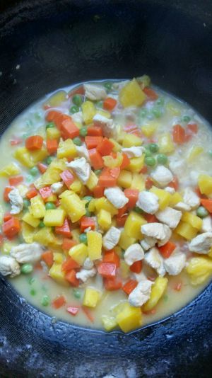 先炒肉在放菠萝,红萝卜和豌豆要先罩水,放适量牛奶提香甜味!