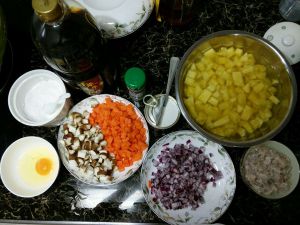 菠萝肉、胡萝卜、黄瓜都切丁备用。鸡蛋打散加入适量菠萝汁。