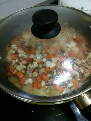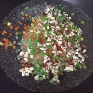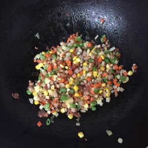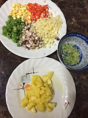 青豆、胡萝卜、洋葱、菠萝热油炒至半熟。