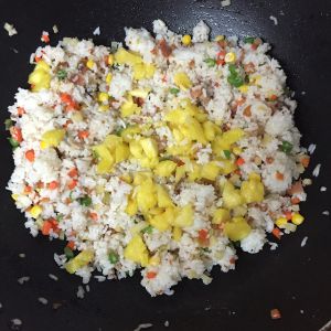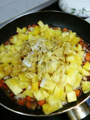 打开锅盖翻炒,直至汤汁差不多收尽,加入菠萝(提前切小块,用盐水泡一会儿)和刚才炒好的鸡蛋,再根据个人的口味加入适量的盐、生抽、黑胡椒、鸡精和一汤勺椰浆。继续中火翻炒。