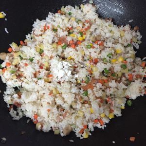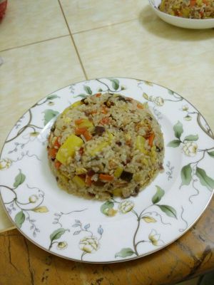 热锅凉油,依次加入胡萝卜丁黄瓜丁菠萝丁翻炒,然后加入米饭,翻炒一下后将打散的鸡蛋倒在米饭上,继续翻炒,加适量盐,生抽调味,翻炒均匀,就可以出锅喽!