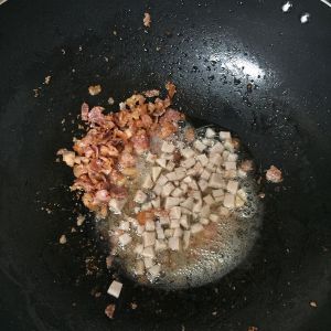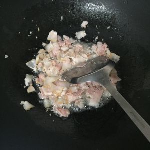 倒入少许生油或植物油,翻炒培根(油不要太多哦)