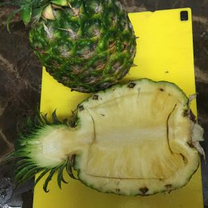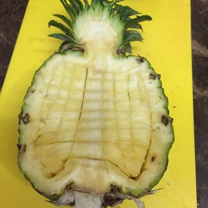 一个没有泡过药水的甜菠萝,这个是已经切开了,果肉掏出来了的,看不出来吧
