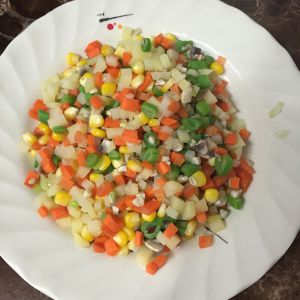红萝卜,土豆,四季豆,白蘑菇,切丁,玉米剥成小粒装,芹菜切末