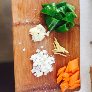 葱切丁,蒜切片,姜切丝,青椒切块,胡萝卜切片