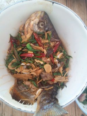 煎好后放水,刚好盖住鱼就好,接下来放辣椒,豆豉,盐,煮到锅里剩余部分水开锅,放酱油,味精,起锅,搞定了