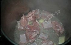 热锅下少许油,油热后下姜片爆锅,下入排骨段,炒至变色。