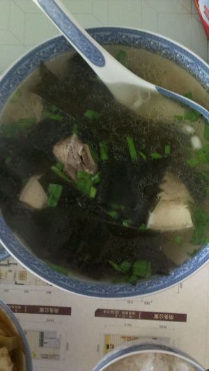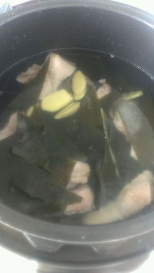 把排骨和海带放在高压锅里,加足量水,切小块姜片和少许盐一起煲30分钟。