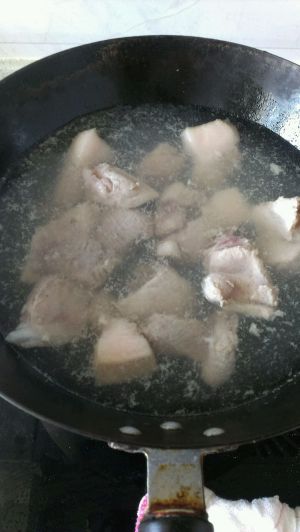 开水焯烫五分钟,打去浮沫,捞出过冷水。