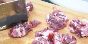 第一次小火炖煮期间准备其他食材:玉米切段(容易入味,吃起来也方便)胡萝卜、山药切滚刀块儿,装盘备用。