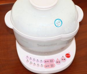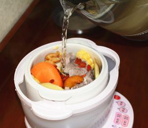 将食材全部放进陶瓷锅里,再将陶瓷锅放在防烫环上,陶瓷锅加满水,塑料外锅加水至放盅后最高刻度线,盖上陶瓷盖子、塑料盖子