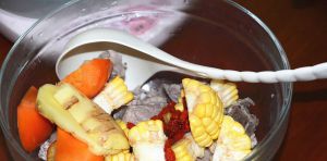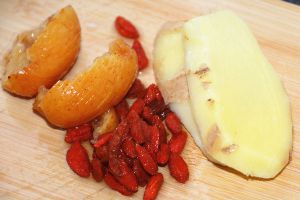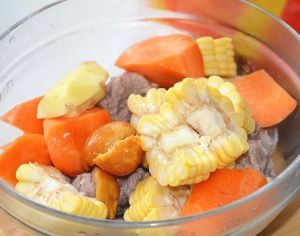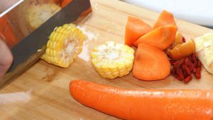 胡萝卜、玉米切块,生姜去皮切块,梧州蜜枣洗净拨开,枸杞洗净,一起放在盆里