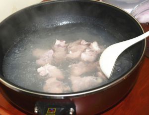 排骨洗净,锅里水烧开,放入煮一会儿捞出,用清水冲去浮沫
