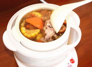 汤锅中的排骨汤煮成乳白色,将胡萝卜,玉米,番茄一起加入排骨汤中,用小火熬40分钟,把胡萝卜和排骨熬烂,加入少许鸡精和胡椒即可!