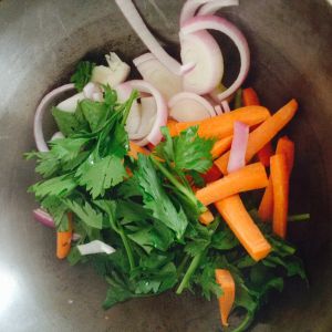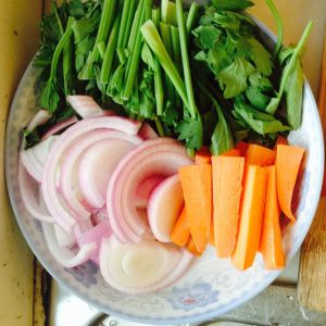 西芹,洋葱,胡萝卜,切丝。稍微粗些没关系。