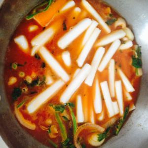 然后放入辣酱,放入年糕,翻炒,放入少许盐和糖,继续翻炒几下,加入水,水量和菜量平行就行了。小火煮一会儿。