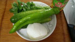 分别将黄瓜、青椒和洋葱切块,香菜切段。