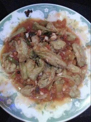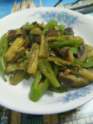 热锅加油下茄子和尖椒,待茄子吸收油的时候加15ml水焖锅,大约焖1分钟左右加入豆瓣酱及香菜翻炒均匀即可出锅。