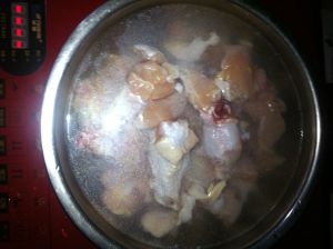 1.先用水把鸡腿煮干,水没过鸡腿!记得放盐!