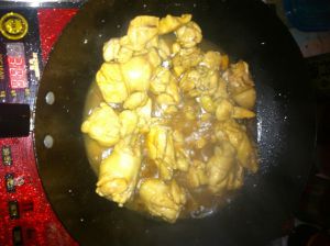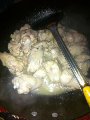 先将姜切丝,干辣椒切段,炒香,倒入切洗好的鸡腿翻炒加入盐,烧出油后加入鸡精,老抽,胡椒烧至上色。
