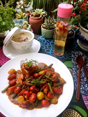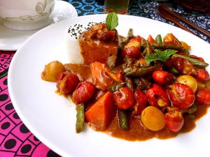 油热,把蔬菜先炒下捞出,留油放姜片炒香,倒虾黄炒香,放小龙虾,加一勺料酒,虾壳变红加两大勺红咖喱酱炒匀,放炒过的蔬菜,放开水,淹没菜,中火焖熟,沟淀粉,放薄荷叶,淋少许油出锅!