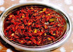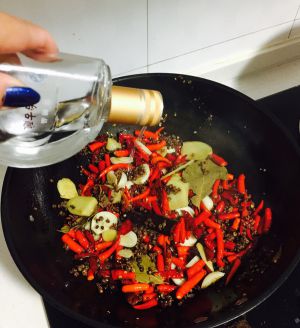葱姜干椒入锅,火锅底料,香料下锅炒香,下龙虾炒制,加水没过龙虾即可