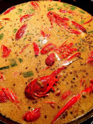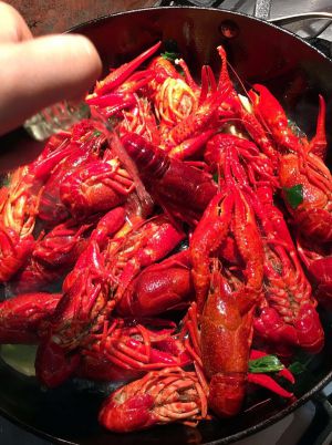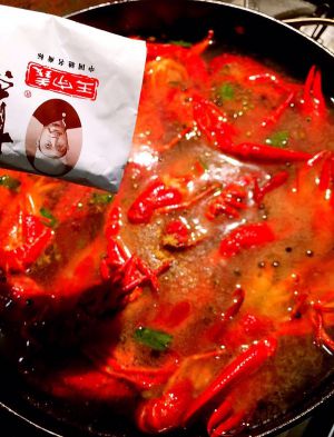 锅中热油,放入第二步中的辛香料,爆香后倒入小龙虾尾,翻炒 Alice这次买了750g的小龙虾,真的不够啊,大家记得多买点