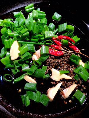 热油锅里放入葱、姜、花椒、干辣椒翻炒至出香味。
