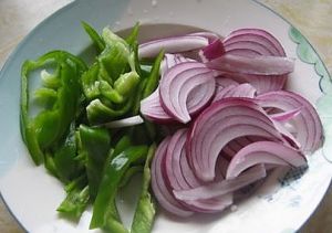 加入青椒和洋葱蛤蜊一起翻炒,然后再加入蚝油,白糖少许,翻炒后蛤蜊都张开口即可(因为蚝油和豆瓣酱本身有咸度,所以无需放盐)