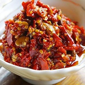 锅热后倒油,加干辣椒、葱姜、辣酱翻炒