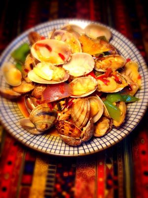 锅内放入油,烧开后放入辣椒,葱,蒜,花椒爆锅。将洗好的蛤蜊倒入锅中,来回翻炒,倒适量料酒,翻炒,放入蚝油,翻炒,在放入香辣酱,炒匀后,加入圆葱。在翻炒几次。