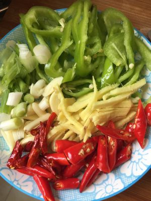 辣椒段,麻椒,香味3片,葱姜蒜,白糖。