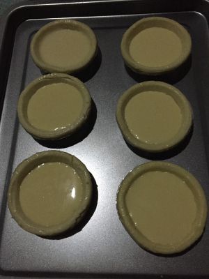 盛挞水,如果是做水果或是其他口味的蛋挞,再倒入挞水前把水果等先放在挞酥里面,再加挞水,挞水加八分满即可……
