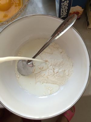 取一勺面粉,加入150ml牛奶,100ml淡奶油,搅拌均匀