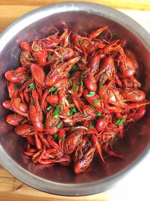 倒油,加入葱、姜、蒜炒香后将小龙虾放入锅中翻炒