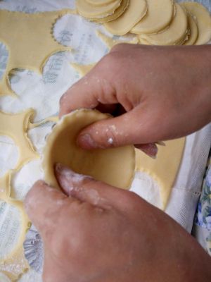 然后用圆模具扣成面皮放在蛋挞模具里用手按匀。
