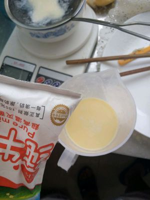 打两个鸡蛋加牛奶,水,糖搅拌均匀。