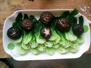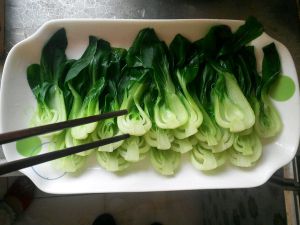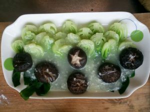 油菜摘好洗净,香菇洗净后用水泡软去蒂。一定要先将香菇洗净再泡水哦