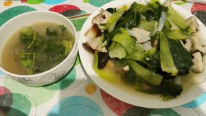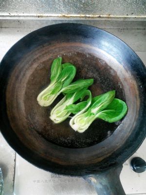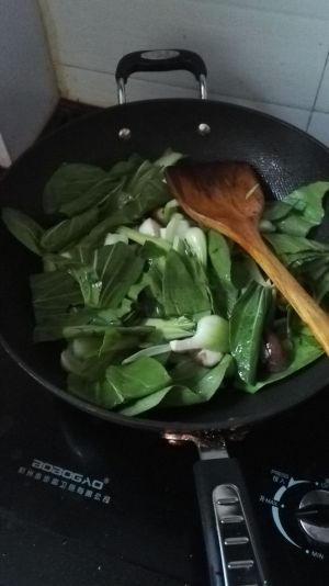 锅内热油,洗好的油菜炒至断生,放盐和泡香菇的水翻炒入味后