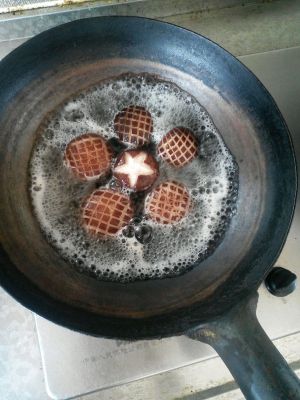 盛出油菜后,把挤好水的香菇丢进锅里,入一小勺蚝油,一小勺泡香菇的水,煮至水收干变浓稠