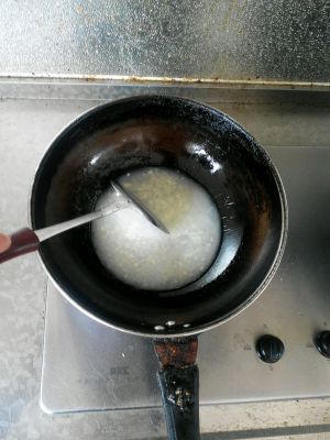 放10g油,小火把调制好的水淀粉倒入,用锅铲慢慢搅动,起泡时把蒜蓉倒入。
