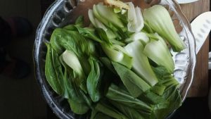 估计倒入油准备呛锅,放葱花西红柿,炒出香味放香菇丁炒下,因为香菇比较不爱熟,然后倒入水放油菜等水烧开