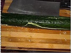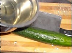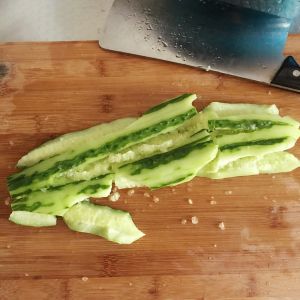 第一步:把黄瓜洗干净,然后用刀把黄瓜拍碎,然后再切成条状,装进碗里。