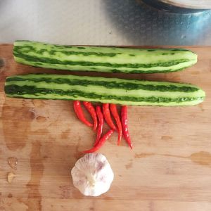 准备材料黄瓜两根,大蒜一颗,朝天椒五到六个!