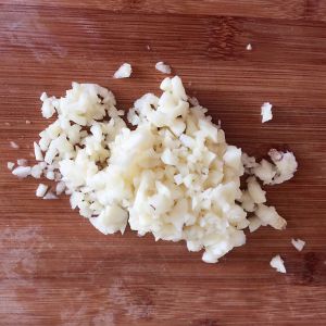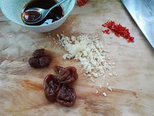 第二步:把大蒜切成末,然后依次把食盐,蒜末,老干妈,有材料的话还可以当花生,香菜进去。