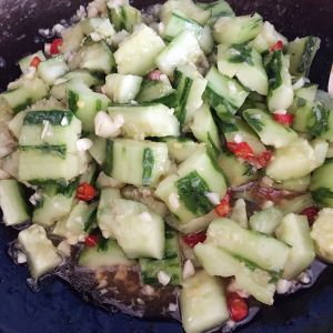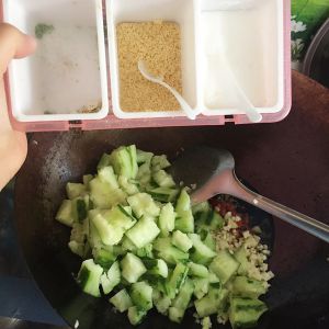 将蒜末和黄瓜倒入放凉的辣椒油里面