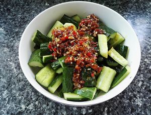 把酱汁淋在黄瓜上,吃时拌匀,让每块黄瓜都蘸着酱汁吃:
