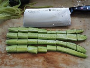 整条黄瓜放在菜板上,用刀两面拍扁;