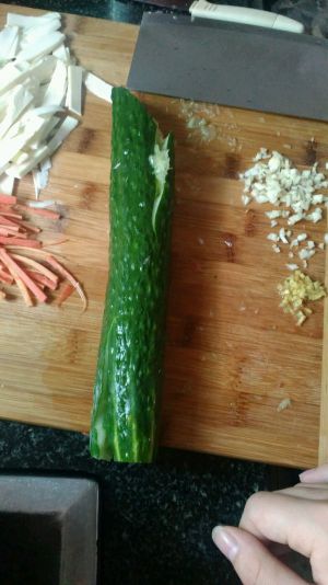 将整个黄瓜用刀拍,使黄瓜自动裂开。姜蒜弄好备用,胡萝卜丝切好备用。